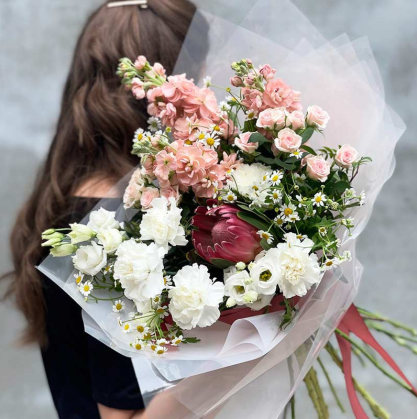 Нежный букет из экзотических цветов. В основе букета находится протея, которая сочетается с ромашками, эустомой, розами...